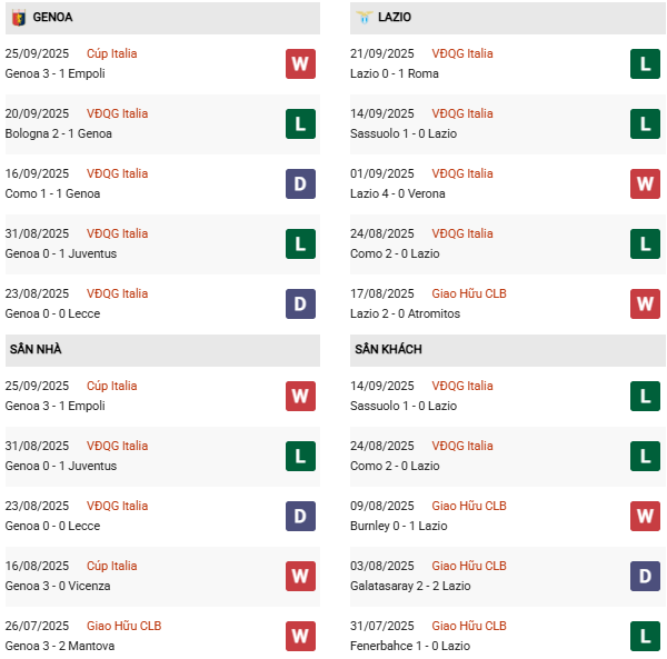 - Trên sân nhà, Genoa thắng 2, thua 5 trước Lazio.