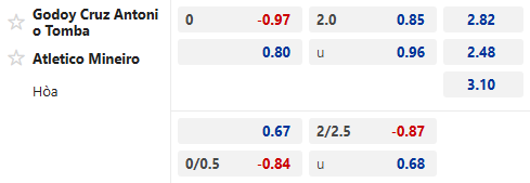 Với tình thế hiện tại, tỷ lệ kèo châu Á trận này đang dừng ở mức hòa được thua. Đội khách sở hữu chất lượng đội hình vượt trội và bản lĩnh hơn ở đấu trường quốc tế. Godoy Cruz chắc chắn sẽ dồn toàn lực để hy vọng lật ngược tình thế, nhưng bản lĩnh và đẳng cấp của Atlético Mineiro vẫn mang đến sự khác biệt.