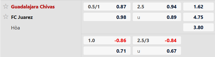 Thông tin tỷ lệ Guadalajara vs Juarez: