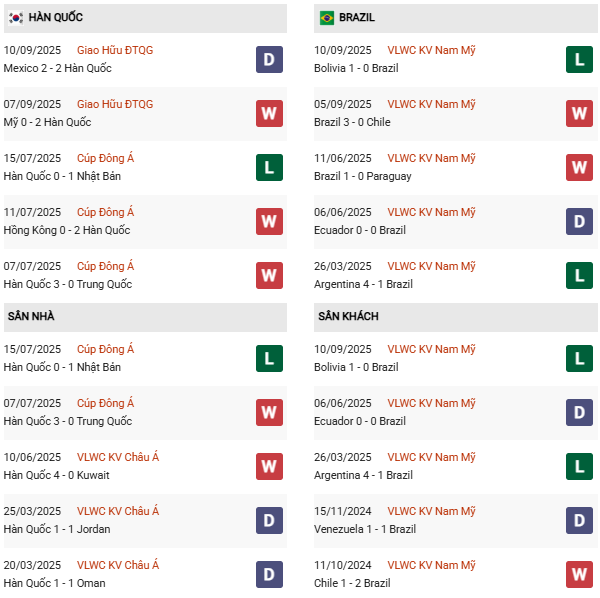 Thống kê phong độ Hàn Quốc vs Brazil: