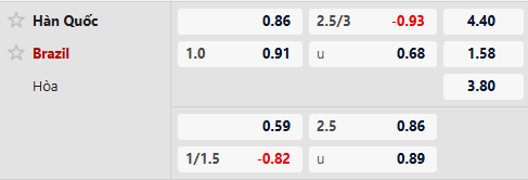 Thông tin tỷ lệ kèo bóng đá Hàn Quốc vs Brazil: