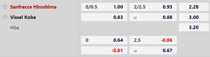 Thông tin tỷ lệ kèo Hiroshima vs Vissel Kobe:
