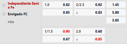 Kèo châu Á được giới chuyên gia đưa ra ở mức Santa Fe chấp -1. Đây là tỷ lệ phản ánh sự ưu ái cho đội chủ nhà, xuất phát từ việc Santa Fe đang bất bại trên sân nhà và có thành tích đối đầu vượt trội, đặc biệt với 4 chiến thắng liên tiếp trước Envigado tại El Campín. Tuy nhiên, trên sân khách, Envigado thậm chí còn gây ấn tượng mạnh hơn và điều đó cho thấy đội khách có khả năng tạo ra bất ngờ và không dễ bị khuất phục.