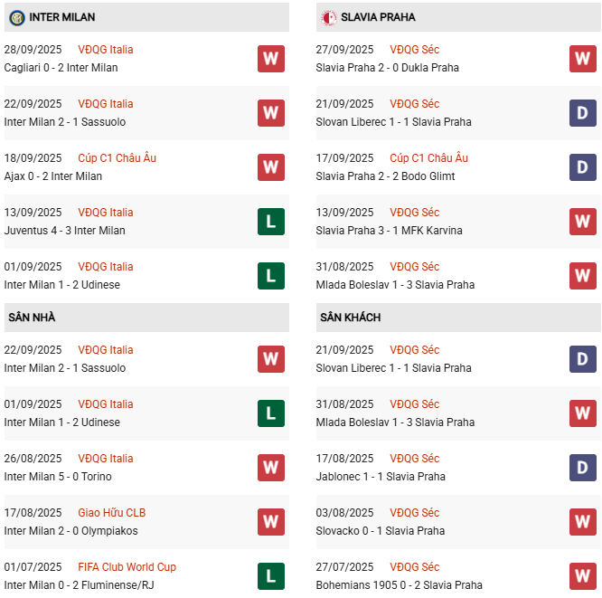 Phía bên kia, đối thủ lần này của Inter Milan là Slavia Praha. Lịch sử không đứng về phía đại diện Séc khi họ chưa từng thắng trên đất Ý, thậm chí thua 7/8 chuyến làm khách tại đây. Dù vậy, Slavia Praha bước vào trận đấu này với tinh thần không hề kém cạnh.