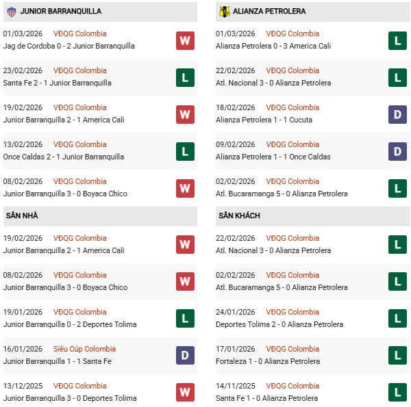 Thống kê phong độ Junior vs Alianza Valledupar: