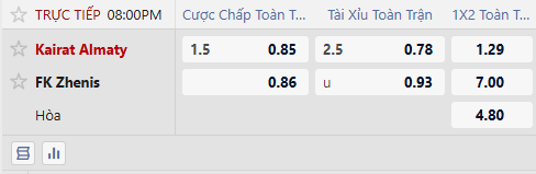 Thông tin tỷ lệ kèo Kairat Almaty vs Zhenis: