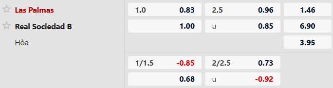 Dễ hiểu khi Las Palmas đang là đội được đánh giá nhỉnh hơn với kèo chấp 1 hòa. 2 lần chạm mặt trong quá khứ, Las Palmas chưa từng thua trước Sociedad B. Tuy nhiên, với phong độ cao của dàn cầu thủ trẻ Xứ Basque, họ đang sẵn sàng giành điểm trên sân của Las Palmas và thắng luôn kèo châu Á.