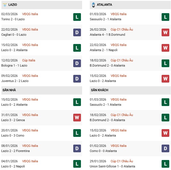 - Trên sân nhà, Lazio thắng 2, thua 4 trước Atalanta.