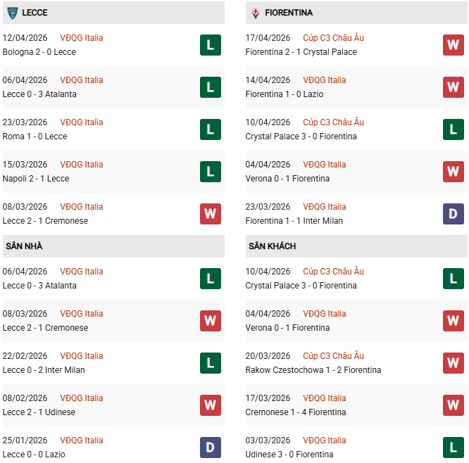 - Trên sân nhà, Lecce thắng 2, thua 4 trước Fiorentina.