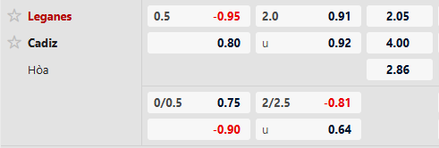 Không thắng ở trận mở màn nhưng với lợi thế sân nhà cùng dàn nhân sự nhỉnh hơn, Leganes đang là những người được xếp kèo trên. Tỷ lệ kèo châu Á niêm yết là 1/2 bàn nghiêng về phía các cầu thủ chủ nhà. 3/4 trận liền trên thánh địa của mình, Leganes toàn thắng và họ có đủ khả năng để làm được điều tương tự thêm lần nữa trước Cadiz.