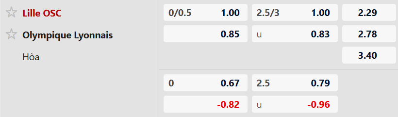 Sàn giao dịch châu Á ghi nhận mức kèo Lille chấp 1/4 trái, tỷ lệ mà họ không có duyên khi tiếp đón Lyon trên sân nhà với 2 trận xuất hiện họ đều bị cầm hòa cả 2. Trận đấu gần đây của Lyon ở mùa giải này được chấp 1/4 trái họ thậm chí đã đánh bại đội đầu bảng Marseille.