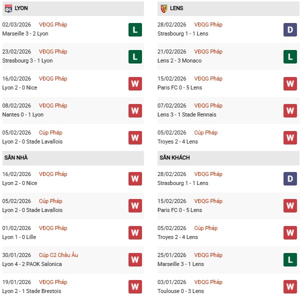 Thống kê phong độ Lyon vs Lens: