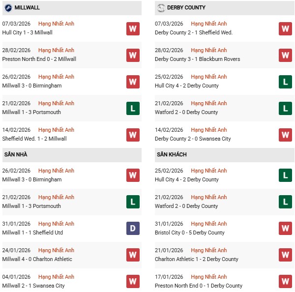 - Trên sân nhà, Millwall thắng 2, thua 3 trước Derby County.
