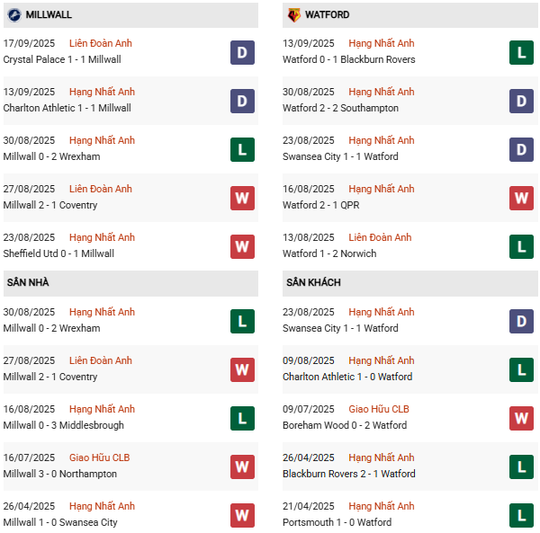 - Trên sân nhà, Millwall thắng 4, thua 4 trước Watford.