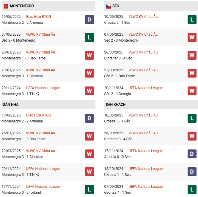 Thống kê phong độ Montenegro vs Séc: