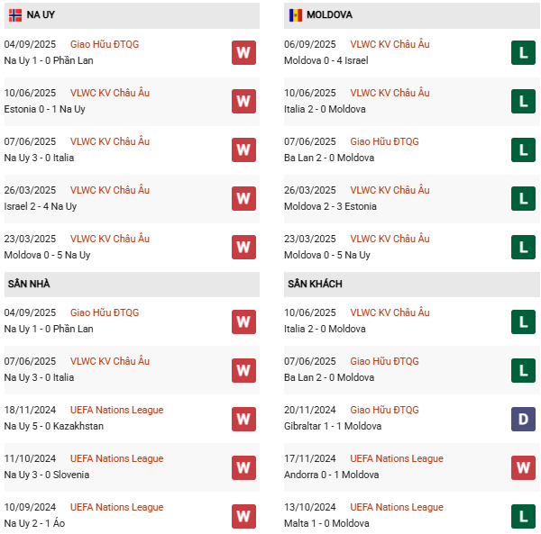 - Trên sân nhà, Na Uy toàn thắng cả 3 trận trước Moldova.