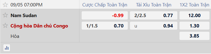 Thông tin tỷ lệ Nam Sudan vs CHDC Congo: