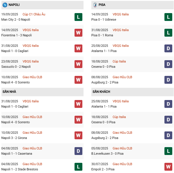 - Trên sân nhà, Napoli thắng 1, hòa 1 trước Pisa.