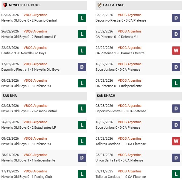 Trong 10 trận gần nhất trên mọi đấu trường, Platense thắng 4, hòa 4 và thua 2 – một thành tích khá tích cực. Tuy nhiên, điểm hạn chế của đội bóng này nằm ở phong độ sân khách khi họ chỉ thắng 2, hòa 3 và thua 5 trong 10 chuyến xa nhà gần đây. Dù vậy, trước một Newells đang khủng hoảng phong độ, Platense vẫn có cơ hội lớn để giành điểm.