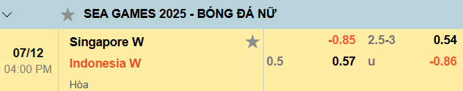 Thông tin tỷ lệ kèo Nữ Singapore vs Nữ Indonesia: