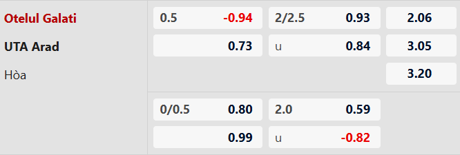 Thông tin tỷ lệ cược Otelul Galati vs UTA Arad: