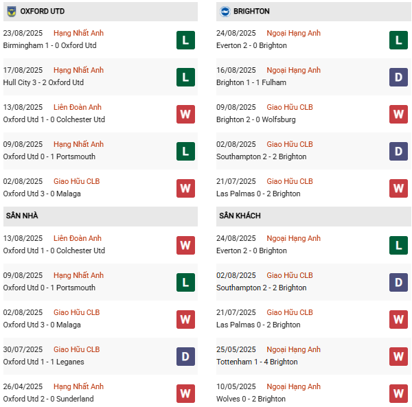 Thống kê phong độ Oxford United vs Brighton: