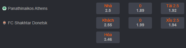 Thông tin tỷ lệ kèo Panathinaikos vs Shakhtar Donetsk: