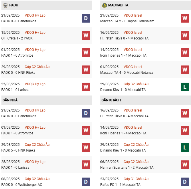 - PAOK thua cả 2 trận đối đầu Maccabi Tel Aviv gần đây.