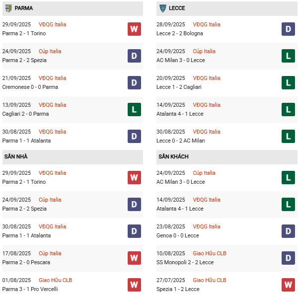 - Parma thắng 5, hòa 2, thua 3 trong 10 trận gặp Lecce gần đây.
