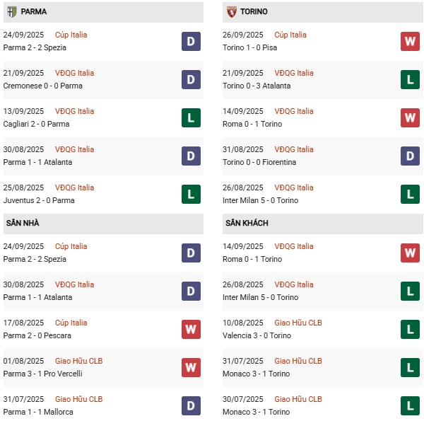 - Parma thắng 2, hòa 4, thua 4 trong 10 trận gặp Torino gần đây.