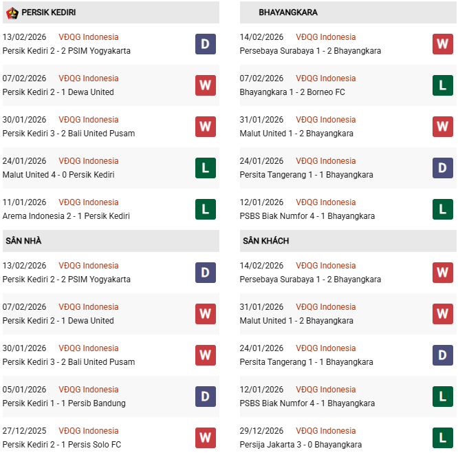 Thống kê phong độ Persik Kediri vs Bhayangkara: