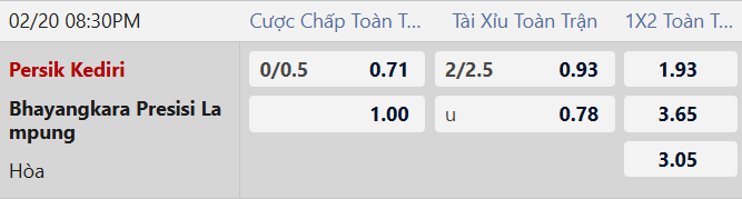 Thông tin tỷ lệ Persik Kediri vs Bhayangkara:
