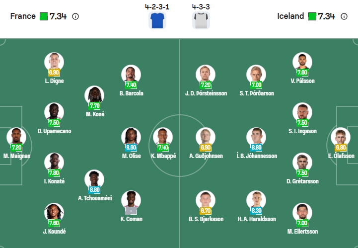 Iceland khởi đầu khá vất vả trước Azerbaijan khi chỉ có bàn mở tỷ số ở phút bù giờ hiệp một, nhưng sau đó chơi chặt chẽ, không cho đối thủ tung ra cú sút nào trong hiệp hai. Thống kê đối đầu lại hoàn toàn chống lại họ: sau 15 lần gặp Pháp, Iceland chưa từng thắng, với 4 thất bại và 1 trận hòa trong 5 lần chạm trán gần nhất từ năm 2012.