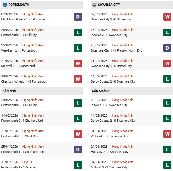 - Trên sân nhà, Portsmouth thắng 1, thua 1 trước Swansea.