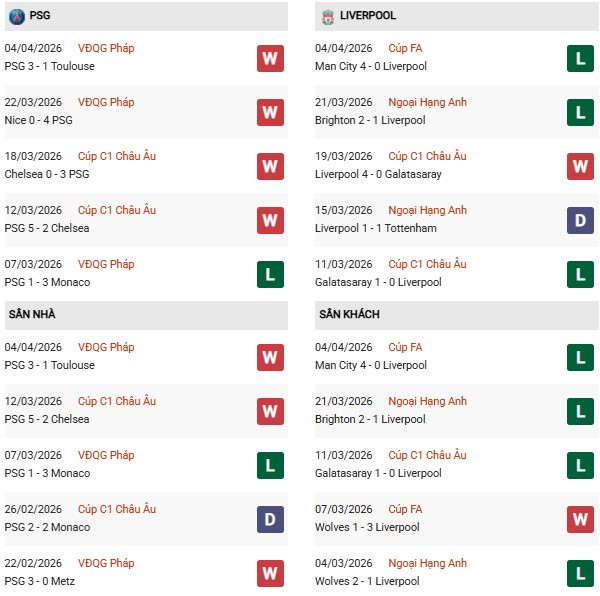 - Trên sân nhà, PSG thắng 1, thua 1 trước Liverpool.