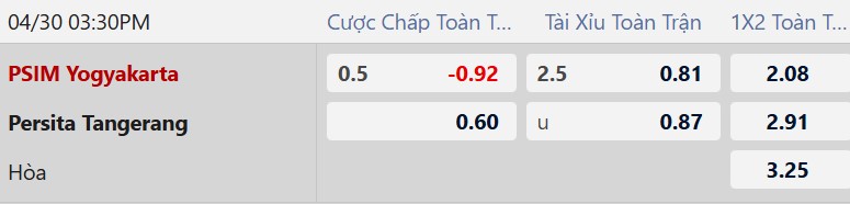 Mức chấp 1/2 bàn cho thấy niềm tin vào khả năng tìm lại niềm vui chiến thắng của đội chủ nhà. Xét về thực lực, hai đội khá cân bằng, nhưng xét về thái độ thi đấu, PSIM Yogyakarta vẫn cho thấy nỗ lực giành điểm cao hơn (thể hiện qua trận hòa Persija). Trong khi đó, Persita đang có dấu hiệu "buông xuôi" với chuỗi trận toàn thua kéo dài. Trước một đối thủ đang khủng hoảng và thi đấu kém cỏi trên sân khách, đây là cơ hội vàng để PSIM phá dớp toàn hòa trên sân nhà.
