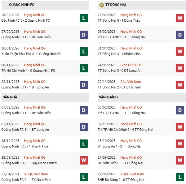 Thống kê phong độ Quảng Ninh vs Đồng Nai: