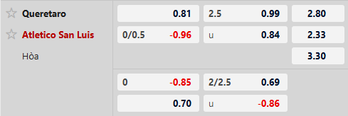 Thông tin tỷ lệ kèo Queretaro vs Atl San Luis:
