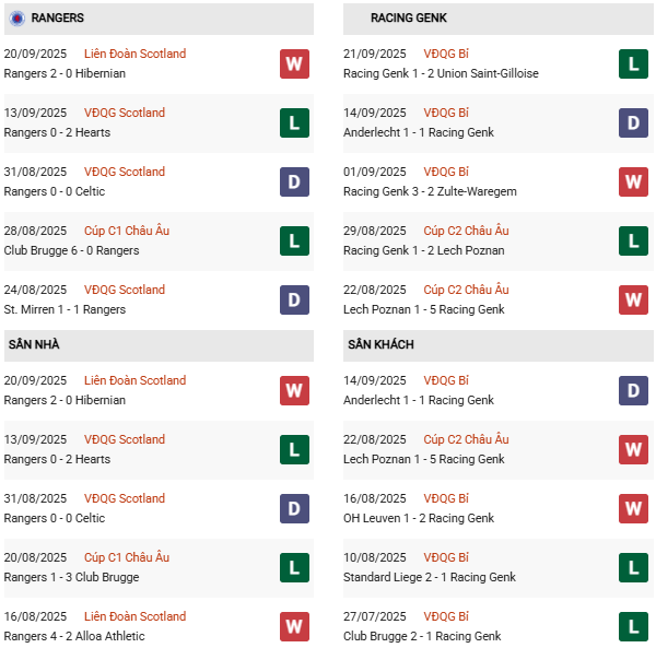 Thành tích đối đầu Rangers vs Genk:
