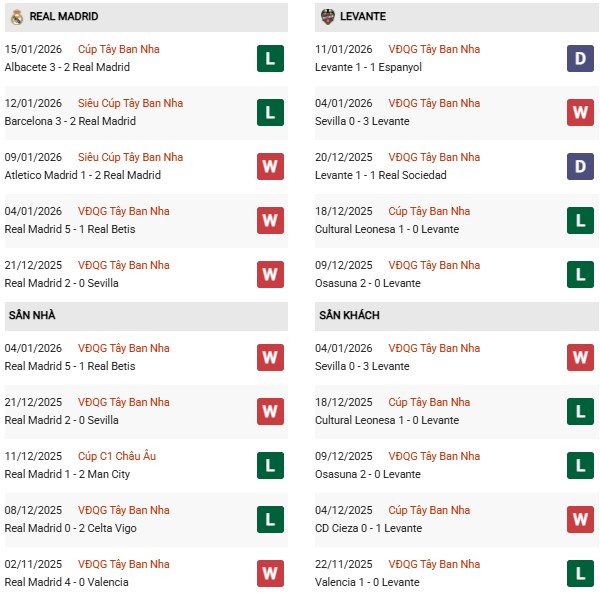 - Trên sân nhà, Real Madrid thắng 7, thua 2 trước Levante.