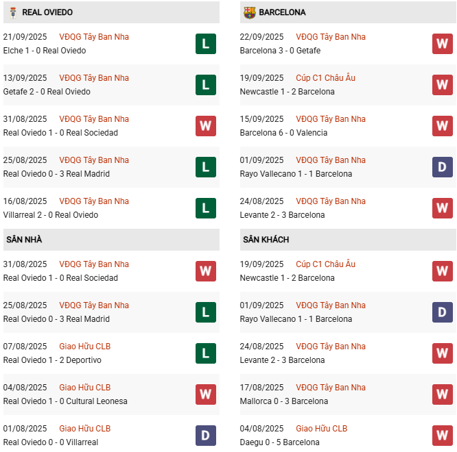 Thống kê phong độ Real Oviedo vs Barcelona: