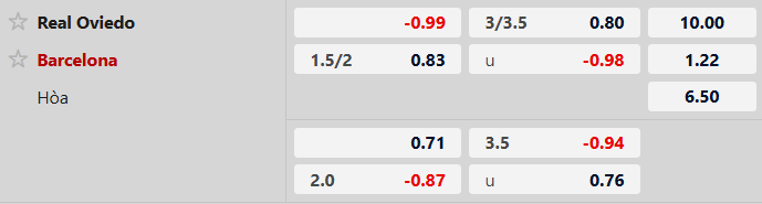 Barcelona chấp Real Oviedo 1 3/4 bàn cả trận. Sự tự tin cùng mạch trận bất bại giúp Barca tràn đầy cơ hội tiếp tục ca khúc khải hoàn khi làm khách của Oviedo. Ở chiều ngược lại, Real Oviedo vẫn loay hoay sau khi trở lại hạng đấu cao nhất. Đội bóng này đã thua tới 4/5 vòng mở màn. Rõ ràng khoảng cách trình độ giữa La Liga và Segunda Division vẫn là thách thức lớn cho tân binh.