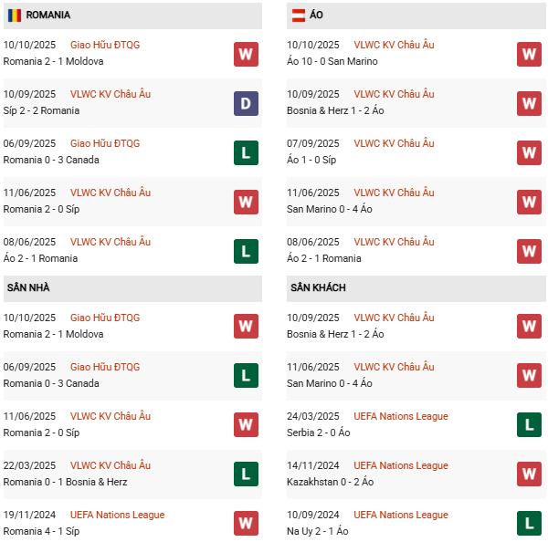 Thống kê phong độ Romania vs Áo: