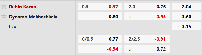 Thông tin tỷ lệ Rubin Kazan vs Dinamo Makhachkala: