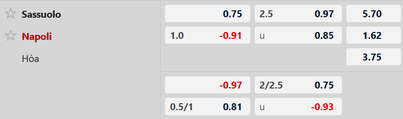 Thông tin tỷ lệ kèo Sassuolo vs Napoli: