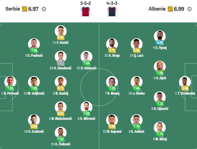 Ở chiều ngược lại, Albania vừa giành chiến thắng tối thiểu 1-0 trước Latvia nhờ quả phạt đền của Kristjan Asllani trong hiệp một. Kết quả này giúp thầy trò huấn luyện viên Sylvinho vươn lên vị trí thứ 2 của bảng K với 8 điểm sau 5 trận, xếp ngay phía trên Serbia. Dù thế, Albania đang đá nhiều hơn Serbia 1 trận và có nguy cơ bị mất vị trí của mình.