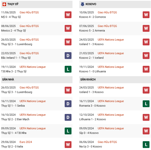 Thống kê phong độ Thụy Sĩ vs Kosovo: