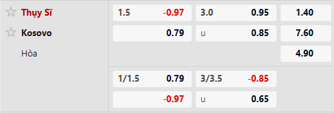 Thụy Sĩ được đánh giá cao hơn khi chấp 1 1/2 bàn cả trận. Thực tế cho thấy Thụy Sĩ sở hữu chất lượng đội hình vượt trội và đủ khả năng kiểm soát thế trận. Kosovo vốn ít có cơ hội cọ xát với các đối thủ mạnh do thường xuyên thi đấu tại Nations League hạng dưới, vì vậy khoảng cách về đẳng cấp sẽ là thử thách lớn. Với sự chuẩn bị tốt cùng phong độ ổn định, nhiều khả năng Thụy Sĩ sẽ tạo ra cách biệt an toàn và giành chiến thắng từ 2 bàn trở lên.