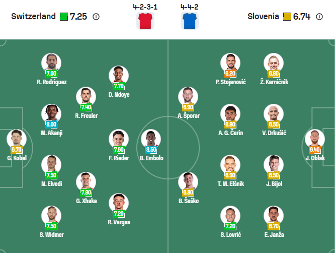 Đội chủ nhà đã có cho mình đến 15 bàn thắng chỉ sau 4 lần ra sân liên tiếp trên mọi đấu trường. Trong khi đó, Slovenia dù có hàng phòng ngự được đánh giá rất cao bởi sự xuất hiện của Jan Oblak trong khung gỗ cũng vừa phải nhận 2 bàn thua trước Thụy Điển. Trước sức tấn công áp đảo của Thụy Sĩ, khả năng Slovenia có thể trụ vững là không cao. Dù vậy, vẫn rất khó để đội chủ nhà có thể thắng tưng bừng ở cuộc đấu này.