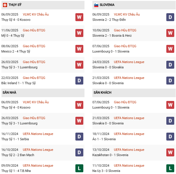 Thống kê phong độ Thụy Sĩ vs Slovenia: